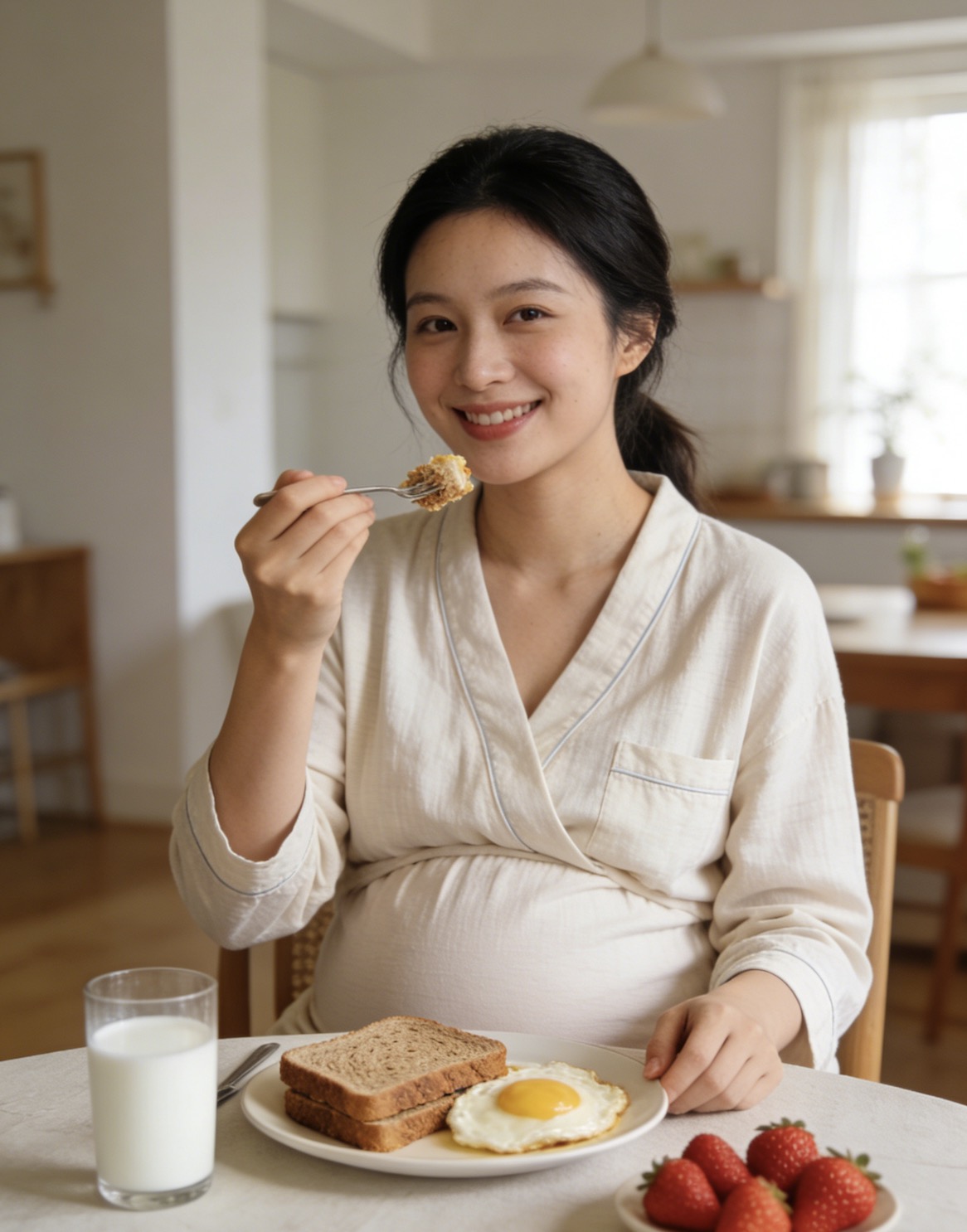 早餐:全麦吐司配鸡蛋 + 一杯牛奶 + 几颗草莓